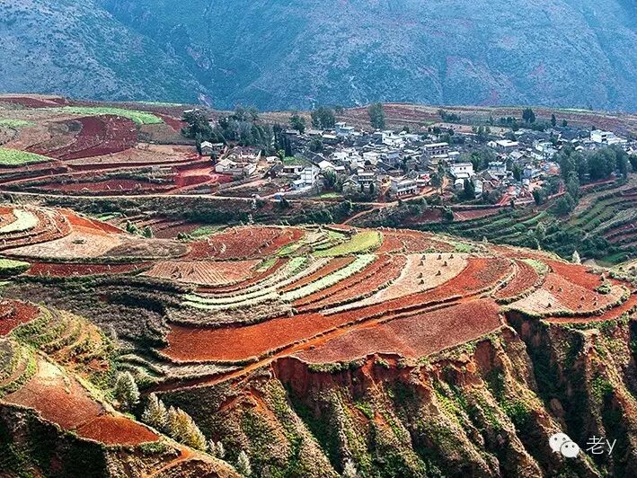 这里是云南最北面(邵通)的东川红土地,被专家认为:是全世界除巴西里约热内卢以外最有气势的红土地,而其景象比巴西红土地更为壮美。鲜艳夺目的红土,层层叠叠的由山谷到山尖。放眼望去,视野之内都呈现出这一种底色,只有明、暗、深、浅等不同层次的区分。红土地!这大地鲜血浸透的红土地!我真的被震撼了。久居城市看到这不同颜色的土地,实在是兴奋,尤其是雨后的土地,颜色更趋于饱和,阳光从云缝中钻出,折射出束束光线。说老实话,我并不像有些艺术大师说的,是被这奇妙的自然景观,和炫目的色彩所征服,我是被这里的蛮荒和贫瘠,是被人类生存的顽强所震慑了。