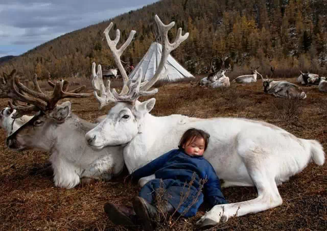 19.蒙古的一个饲养驯鹿的牧场里,牧场主家的小女儿躺在驯鹿身上睡着了