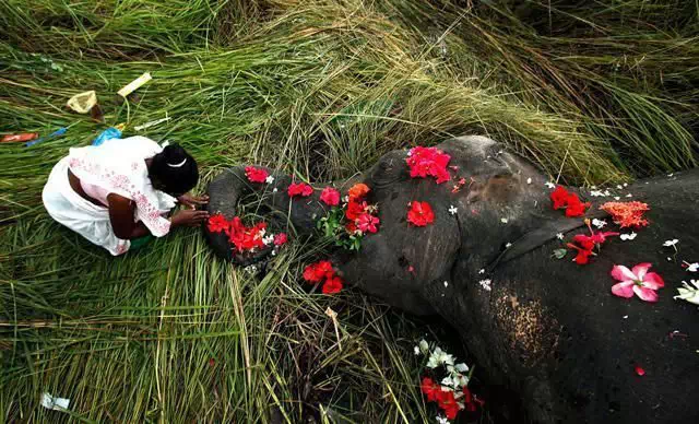 20.在印度,一头大象被火车撞伤致死,一个小女孩为它举行了花瓣葬礼