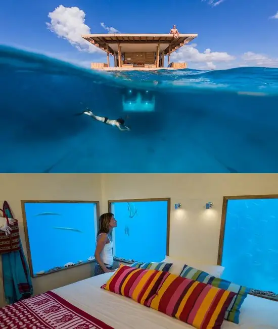 下面这家酒店位于曼塔度假村,共三层,部分漂浮在水上,部分潜伏在水底。在屋顶甲板可钓鱼、日光浴,在主打的海底卧室,可360度观察海洋生物,入夜后的喂食时间更是一绝。